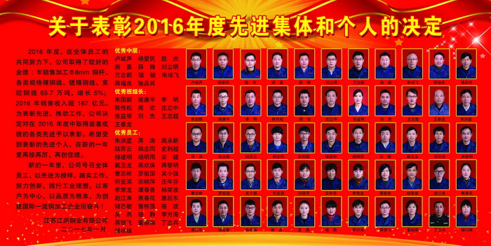 2016年度,在全體員工的共同努力下,公司取得了較好的業(yè)績:年銷售加工Φ8mm銅桿、各類規(guī)格裸銅線、鍍錫銅線、束絞銅線65.7萬噸,增長5%;2016年銷售收入超167億元。為表彰先進(jìn),推動工作,公司決定對在2016年度中取得顯著成績的各類先進(jìn)予以表彰。希望受到表彰的先進(jìn)個人,在新的一年里再接再厲,再創(chuàng)佳績。新的一年里,公司號召全體員工,以先進(jìn)為榜樣,踏實工作、努力創(chuàng)新,踐行工業(yè)理想,以客戶為中心,以品質(zhì)為根本,為創(chuàng)建國際一流銅加工企業(yè)而奮斗。優(yōu)秀中層:盧斌聲、楊愛民、殷 杰、施嘉、薛鋒、劉立明 萬志新、駱駿、朱培飛、蔣福良、駱品其 優(yōu)秀班組長:朱國新、駱康平、李 明、陳傳松、周 歡、莊立中 張益琴、劉 杰、王志超、王春龍 優(yōu)秀員工:朱洪星、蔣濤、高永新、陸蘇云、韓志同、史利超儲建明、楊明雨、宗健、戴玉龍、 高歡保、蔣黎明曹志彬、羅祖國、吳小強(qiáng)、何亞濱、宗曉萍、莊年芬李常龍、譚春香、楊榮波、趙江來、焦春花、唐后東 儲志敏、曾棟強(qiáng)、駱 波、吳燕、駱 靜、李方海 蔣銀飛、董麗娟、丁志兵、儲祥妹